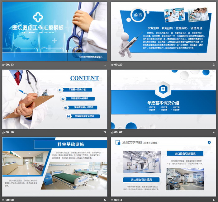 PowerPoint模板内容页,由24张蓝色微立体幻灯片图表制作。另外使用了医生问诊图片、手术室图片、医疗团队、护士打针图片等进行排版。