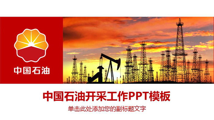 幻灯片模板封面,使用了油气田采油机、气井图片作为背景。左侧放置中石油公司logo。下方填写石油开发PPT标题文字。界面设计与石油行业密切相关。
