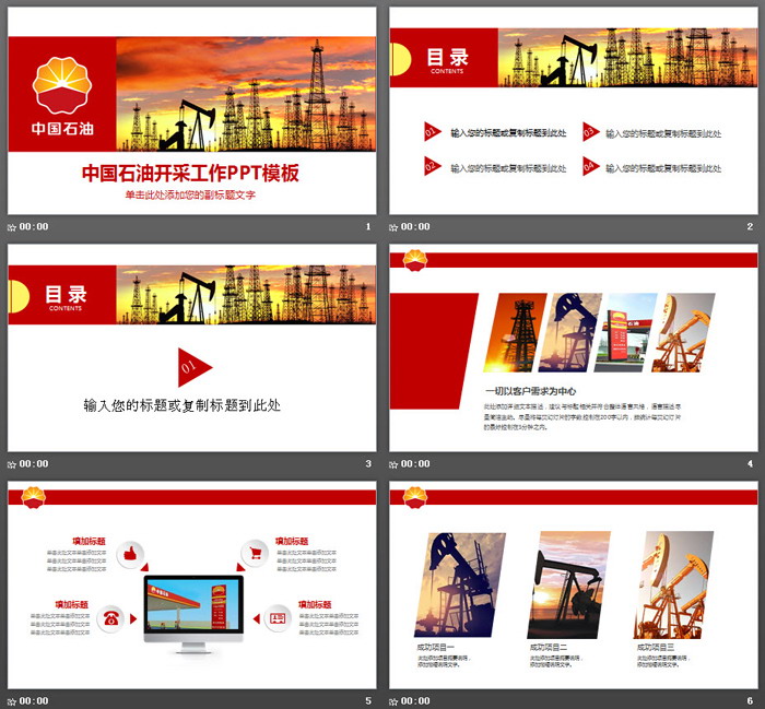 PowerPoint模板内容页,由24张红色扁平化幻灯片图表制作。其中使用了多张油气开发、石油销售图片进行排版。