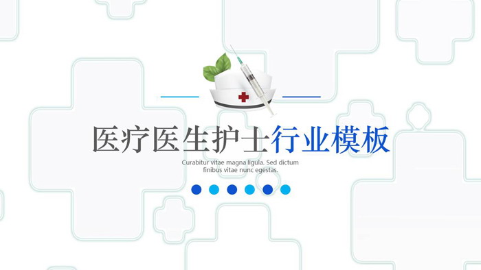 幻灯片模板封面,使用了医疗+号作为背景图片。中间放置一顶护士帽、注射器、绿叶制作的图标作为装扮。下方填写医生护士医疗护理PPT标题文字。界面设计清新简洁。