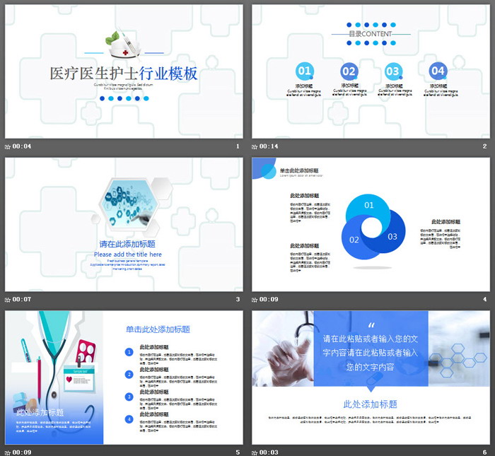 PowerPoint模板内容页,由24张蓝色扁平化幻灯片图表制作。另外使用了医疗场景、手术室图片、护理场景、医生照片、医疗图标等排版。