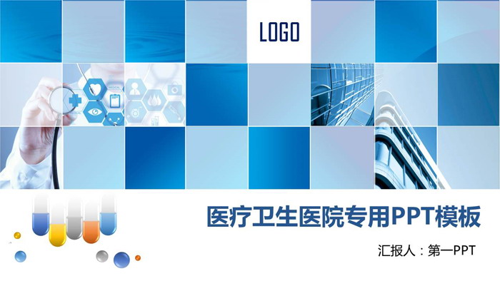 这是一套蓝色方块组合医疗医学PPT模板,共26张;
