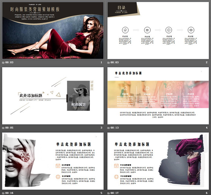 PowerPoint模板内容页,由24张黑色简洁幻灯片图表制作。另外使用了多张时尚女装图片进行排版。