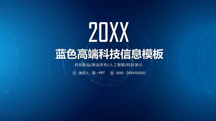 幻灯片模板封面,使用了蓝色渐变底图,点线粒子球体背景图片。中间使用白色字体填写PPT标题文字。界面设计简洁精致,充满科技范。