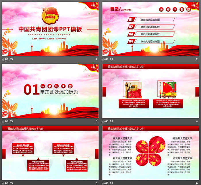 PowerPoint模板内容页,由24张红色动态幻灯片图表制作。内容部分使用了华表图片、天安门图片、五星红旗图片、共青团活动图片进行排版。