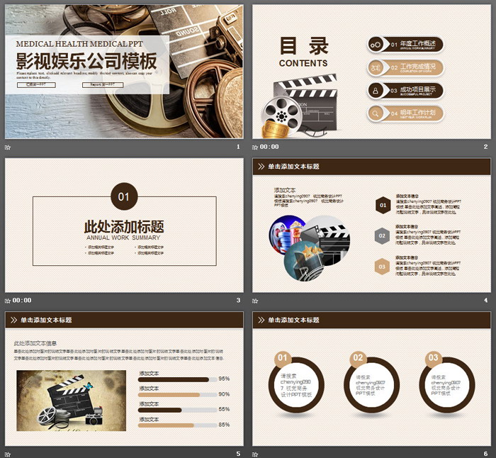 PowerPoint模板内容页,由24张棕色扁平化幻灯片图表制作。另外使用了多张电影图片进行排版。