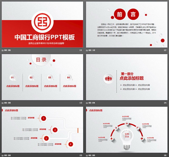 幻灯片模板封面,使用了红白拼接背景。中间放置圆形工商银行logo,背景颜色与工商银行标识色匹配。