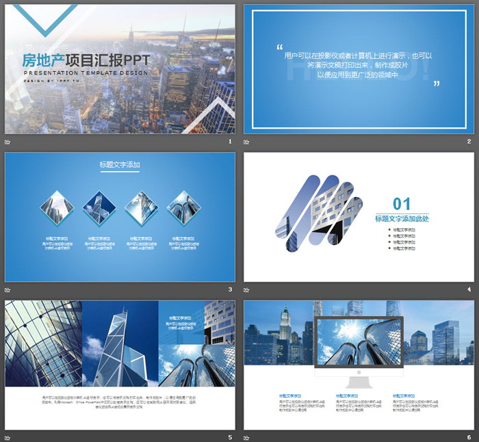 PowerPoint模板内容页,与封面一致。大部分使用图片排版方式制作。排版元素包括:商业写字楼建筑、楼盘建筑等。另外使用了蓝色幻灯片图表对内容进行描述。