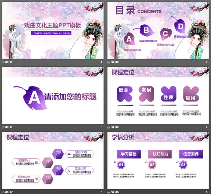 幻灯片模板使用了水彩风格绘制的花瓣、梅花等PPT背景图。PPT模板首页,以为戏曲演员正在化妆图片装饰。中间填写戏曲文化PPT课件标题文字。界面风格唯美艺术,与戏曲主题搭配。