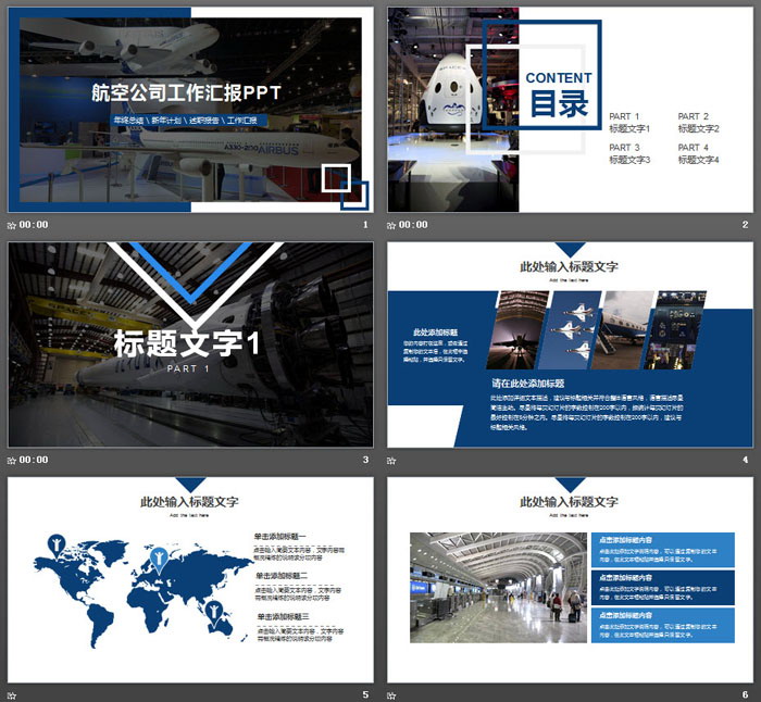 幻灯片模板以蓝色为主色调设计。PPT模板封面,放置了各种飞机模型背景图片。中间填写工作总结汇报PPT标题文字。界面背景与航空航天主题搭配。