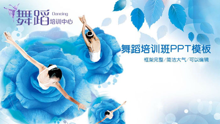 幻灯片模板封面,使用了唯美的蓝色叶子、如同在花朵内舞蹈的女子等PPT背景图。右侧填写舞蹈培训PPT标题文字。界面清新唯美。