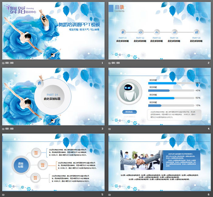 这是一套蓝色唯美风格的,舞蹈主题PPT模板。共25张;