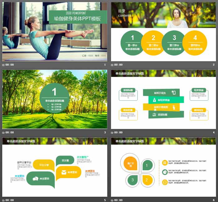 PowerPoint模板内容页,由25张绿色黄色搭配的清新幻灯片图表制作。另外使用了森林、草地等宜居图片排版。
