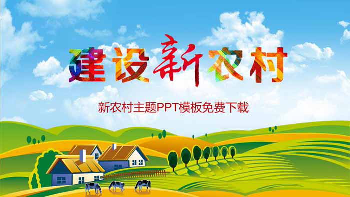PPT模板封面,使用了插画风格绘制的蓝天白云、田野、牛马、农舍等背景。中间放置彩色艺术字“建设新农村”PPT标题。背景元素与新农村PPT主题搭配。