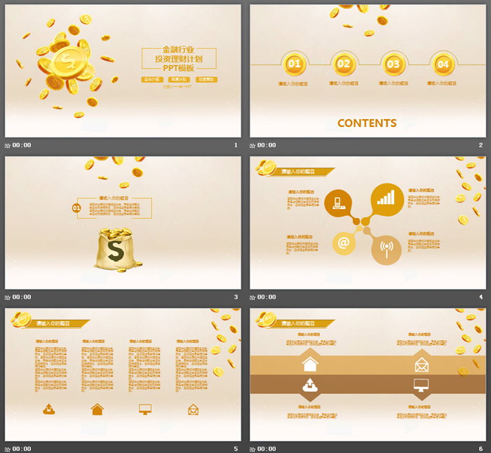 PowerPoint模板使用了金色渐变背景图。PPT模板封面,一堆金币动画引导。右侧填写金融投资理财PPT标题文字。界面背景与金融服务主题搭配。