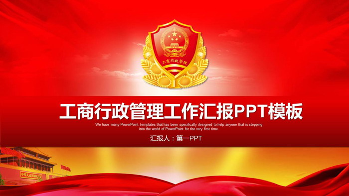 PPT模板封面,使用了红色彩带、天安门等背景图片。中间放置工商行政管理徽章,下方填写 工商行政管理工作汇报PPT标题。界面大气庄严。