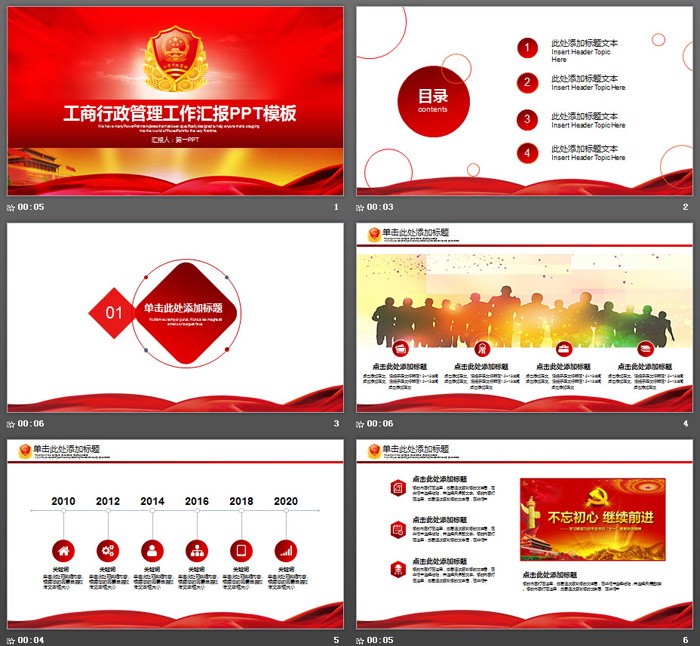 PowerPoint模板内容页,由25张红色动态幻灯片图表制作。另外使用了多张工商行政插图排版。