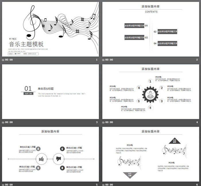PowerPoint模板内容页,由21张灰色黑色搭配的微立体幻灯片图表制作。另外使用了各种音乐元素插图排版。