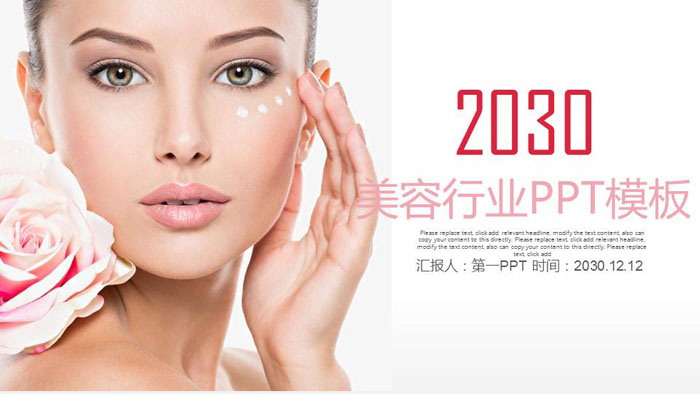 PPT模板封面,使用了美女模特与鲜花背景图片。右侧填写PPT标题文字。界面与美容PPT主题搭配。