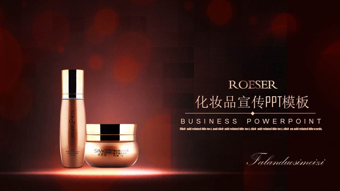 PPT模板使用了红色光晕背景图片。PPT模板封面,左侧放置两瓶设计精致的化妆品图片,右侧使用金色字体填写化妆品介绍宣传PPT标题文字,下方使用优美英文字体填写PPT副标题。
