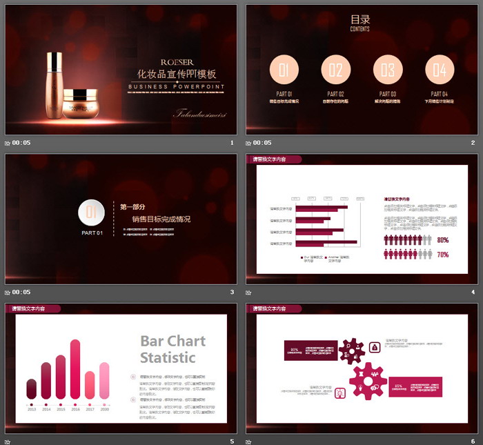 这是一套雅致红色化妆品介绍宣传PPT模板,共28张;