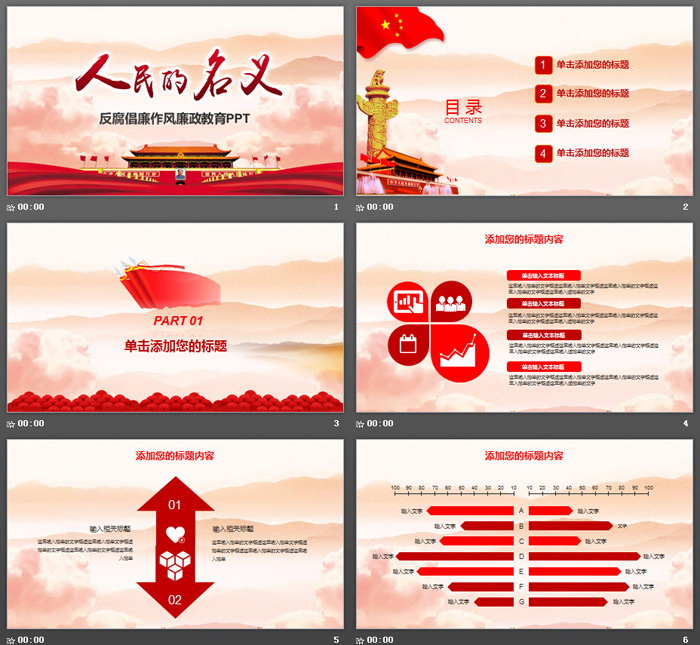 PowerPoint模板内容页,由24张红色动态幻灯片图表制作。另外使用了华表、红旗等党政元素排版。
