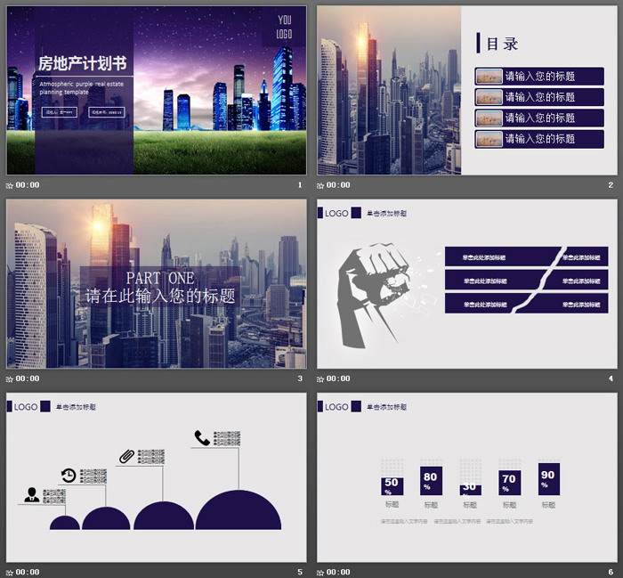 PowerPoint模板内容页,由23张紫色动态扁平化幻灯片图表制作。另外使用了发达城市建筑图片、职场白领图片等排版。