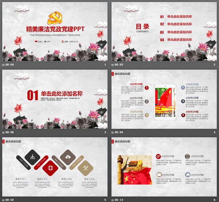 这是一套水墨莲花背景的,党风廉政建设PPT模板,共27张;