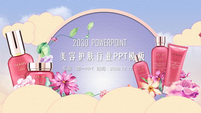 PPT模板封面,使用了蓝天白云底图。底部摆放粉色化妆品和护肤品产品图片。周围使用鲜花藤蔓植物装饰。中间填写护肤品化妆品宣传PPT标题文字。界面背景与美容PPT主题搭配。