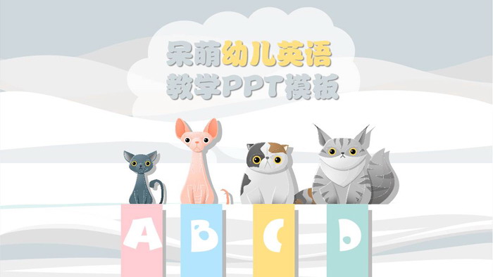 PPT模板封面,使用了灰色波浪线条和四只卡通呆萌小动物背景图片。中间填写英语培训PPT标题文字。下方放置英语字母ABCD。界面卡通可爱。