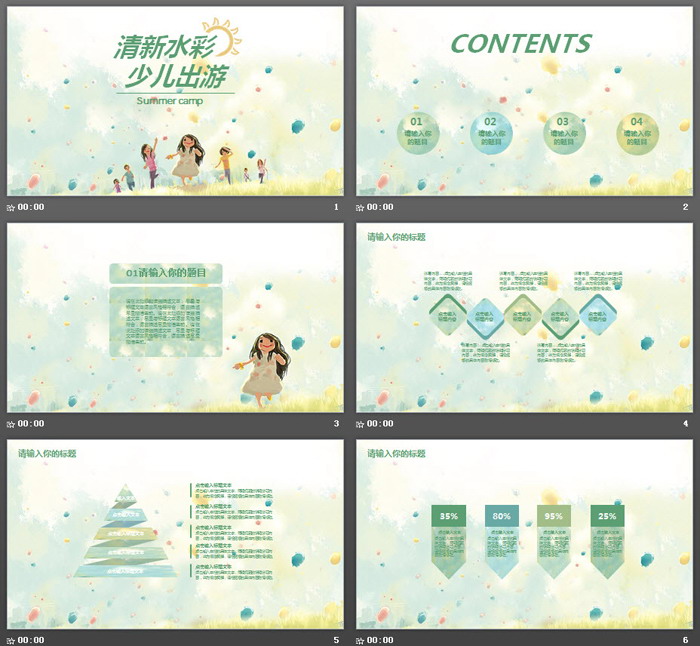 这是一套清新彩色卡通风格的,儿童出游PPT模板。共24张;