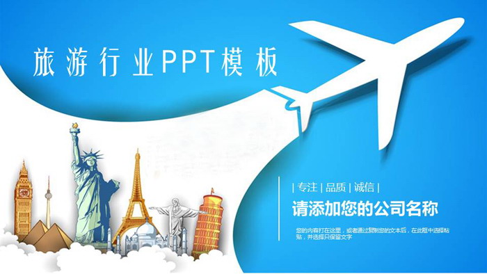 PPT模板封面使用了蓝色底色,左下角放置多个世界著名旅游景点标志建筑插图,右侧一个白色飞机团装饰。PPT模板设计简洁,与旅游PPT主题搭配。
