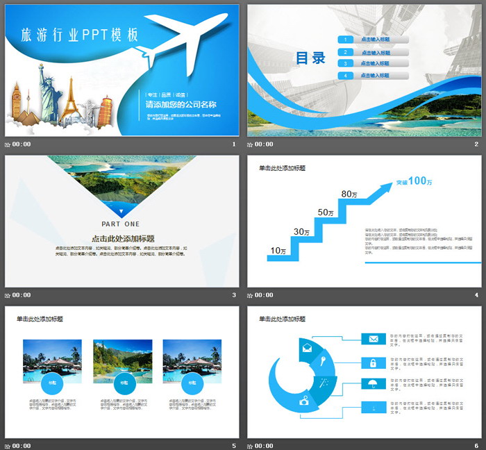 这是一套蓝色飞机剪影背景的,旅游主题PPT模板,共23张;