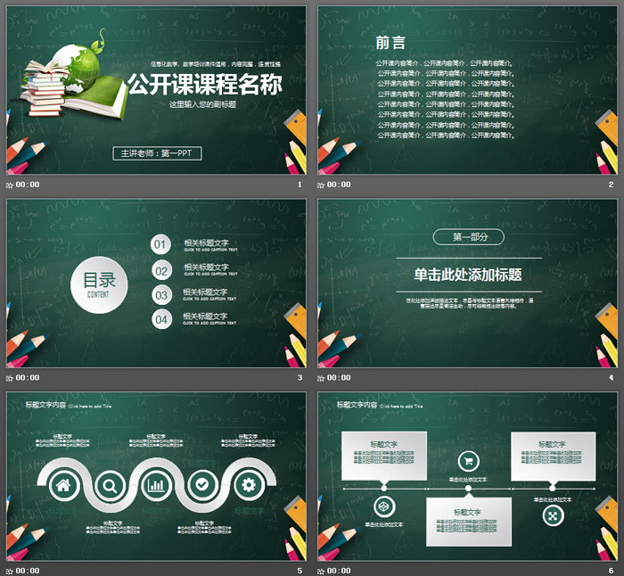 PPT模板使用了写满教学内容的绿色黑板、彩色铅笔等文具PPT背景图。首页放置课本绿色地球等元素装饰,右侧填写教学公开课PPT标题文字。界面背景与教育PPT主题搭配。