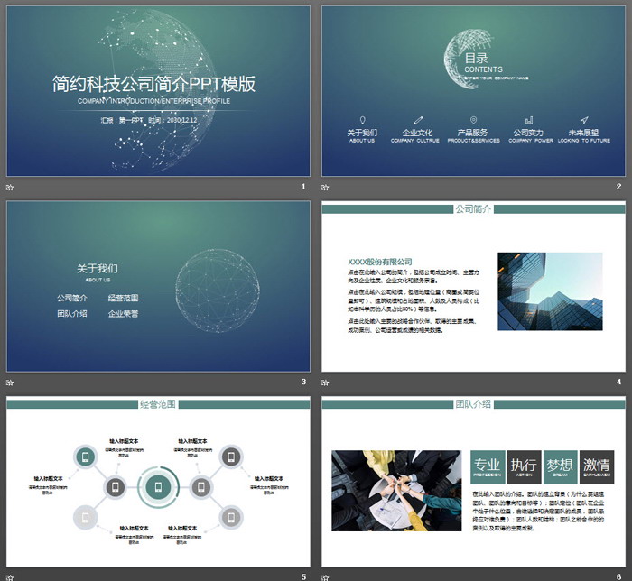 PPT模板使用了绿色渐变PPT背景。首页放置带有科技感的,白色点线虚拟星球图案。中间填写企业简介PPT标题文字。界面简洁且具有科技感。
