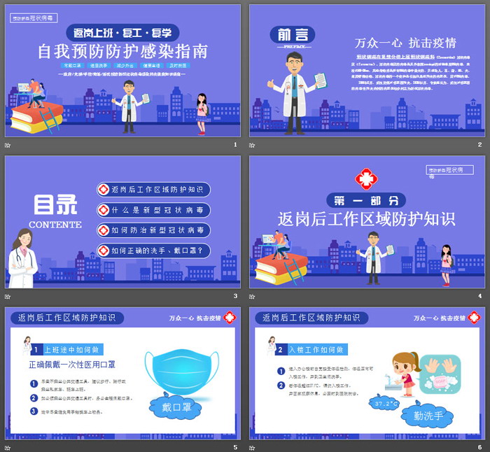 这是一套卡通扁平化风格的,疫情防控返岗复工复产PPT,共32张;