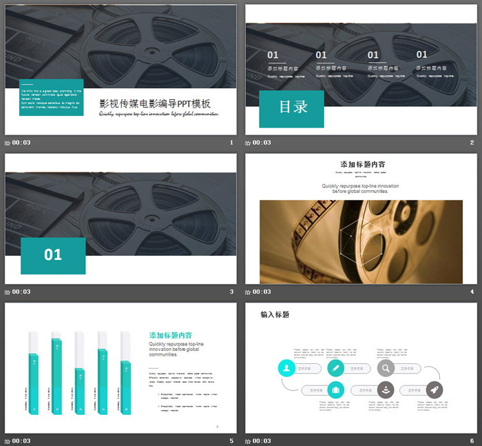 PowerPoint模板内容页,由22张青色动态扁平化幻灯片图表制作。另外使用了单反相机插图、摄像机插图、电影海报插图等排版。