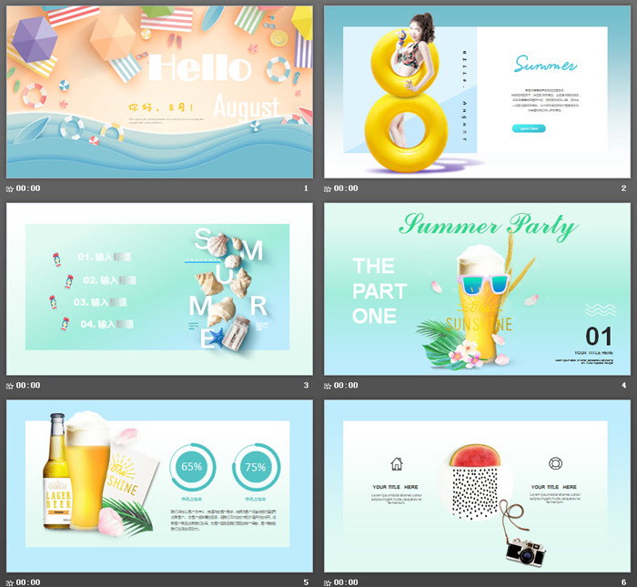 这是一套清爽夏日海滩背景的八月你好PPT模板,共28张。