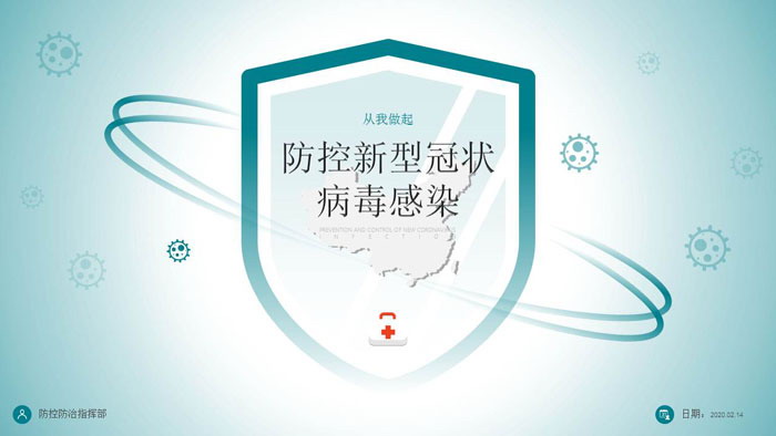 PPT模板首页使用了病毒图案、医疗卫生图案、中国地图剪影等PPT背景图片。中间填写防控新型冠状病毒感染PPT标题文字。界面背景与疫情防控PPT主题搭配。