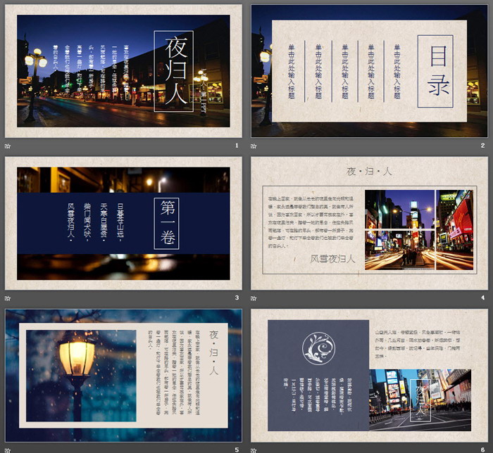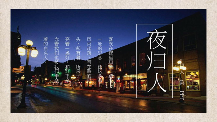PPT模板使用了复古纸张背景图片。首页放置去旅行的城市夜景图片,中间填写旅行相册PPT标题,以及说明文字。