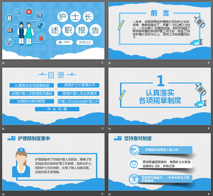 PowerPoint模板内容页,由20页蓝色灰色配色的幻灯片图表,搭配述职报告文案排版。另外使用了多张卡通医疗人物PPT插图装饰。