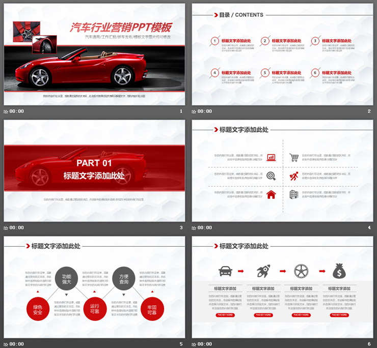 PowerPoint模板内容页,由24张红色灰色搭配的幻灯片图表,搭配PPT文字排版。另外使用了多张新品跑车PPT插图装饰。