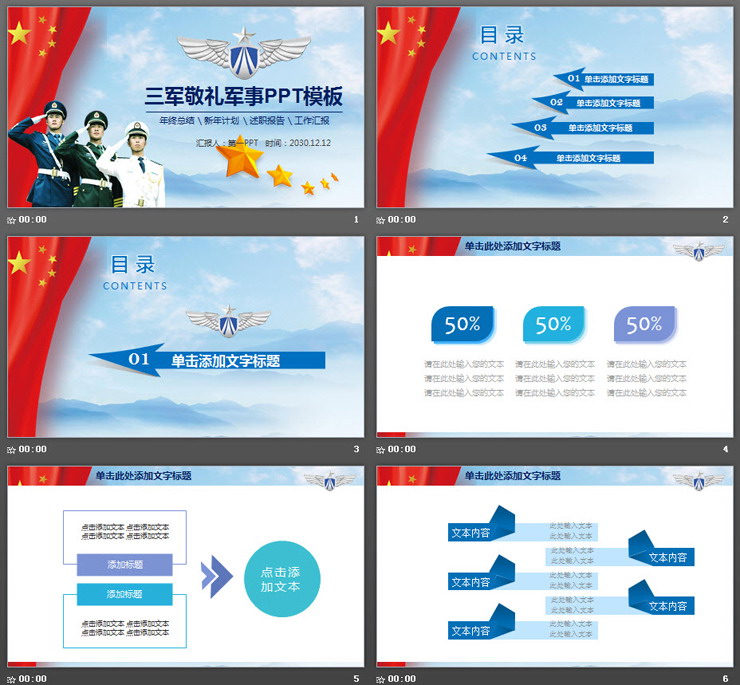 PPT模板封面,使用了蓝天白云、五星红旗、海陆空三军敬礼PPT背景图片。右侧填写PPT标题文字。