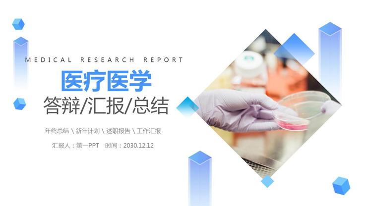 PPT模板封面,使用了蓝色立方体、细胞培养皿等背景图片。左侧填写PPT标题文字。界面简洁与医疗医学PPT主题搭配。