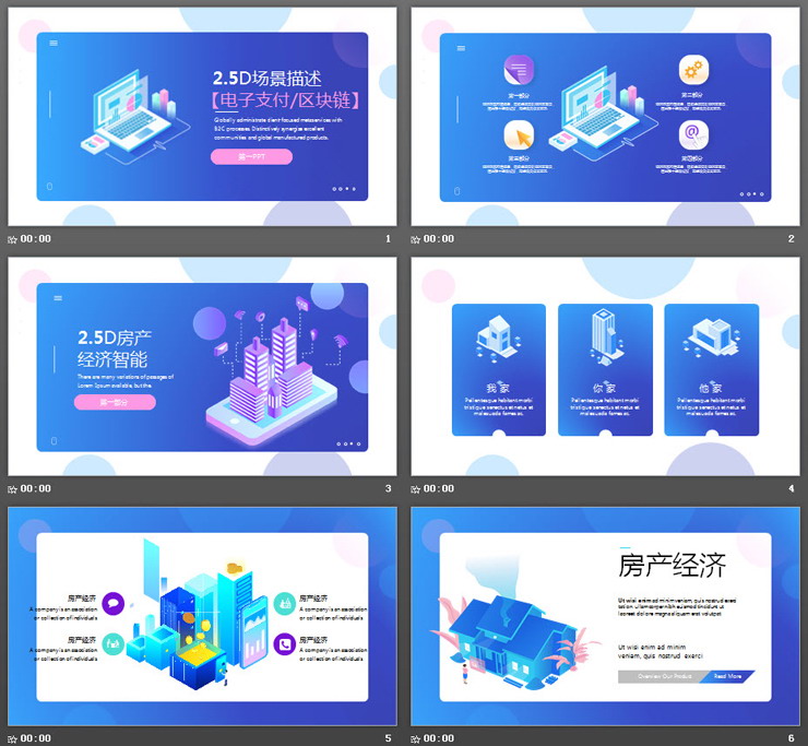 PowerPoint模板内容页,由23页2.5D风格的,与电子支付和区块链应用相关PPT插图,搭配幻灯片文字排版。