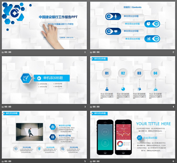 蓝色微立体动态手势背景建行工作总结PPT模板,共33页;