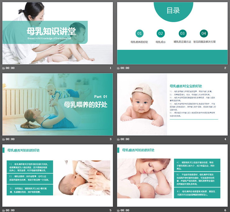 PPT内容页,主要讲解了:1、母乳喂养的好处,2、母乳成分,3、哺乳的正确方法,4、常见问题及解决方案;.PPTX格式