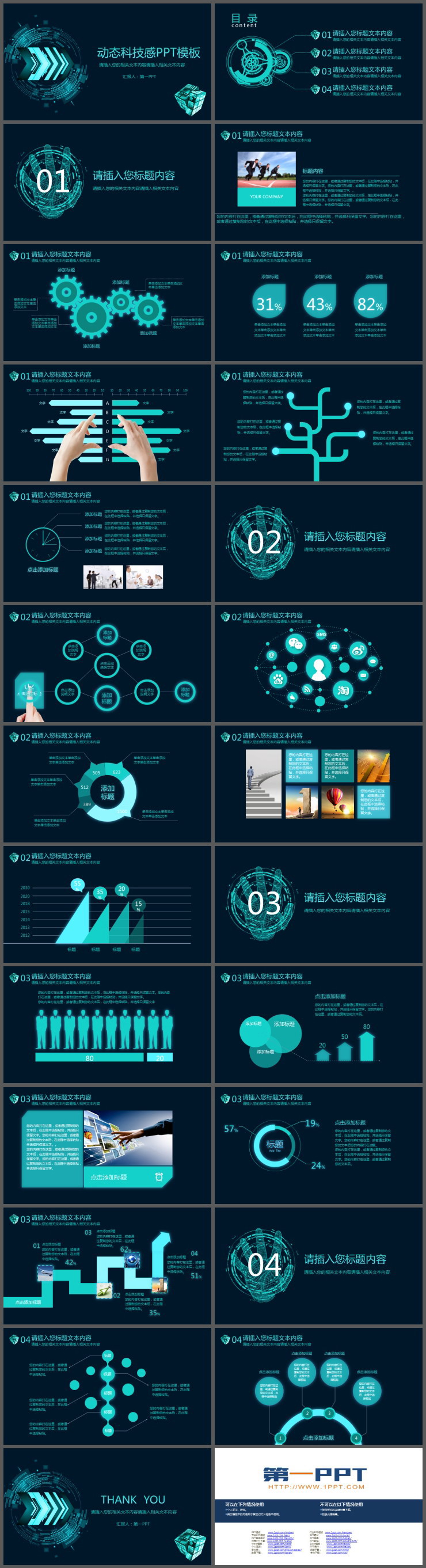 PowerPoint模板内容页,由23张蓝色荧光效果的幻灯片图表,搭配PPT文字排版。另外使用了人物手势、科技手势等装饰。
