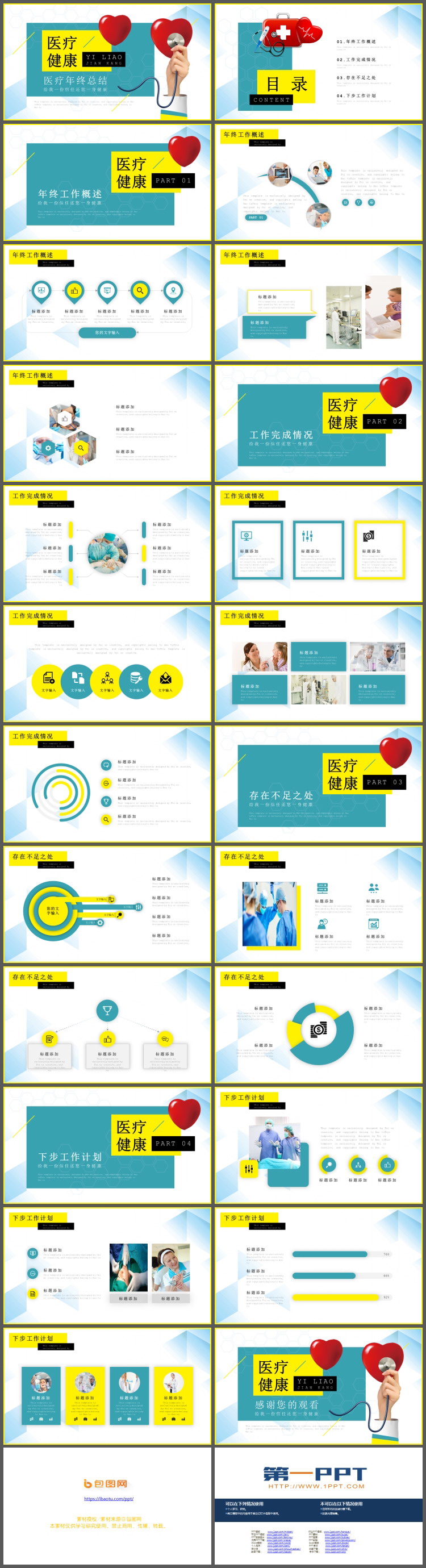 PowerPoint模板内容页,由22张蓝色黄色配色的幻灯片图表,搭配PPT文字排版。另外使用了医生PPT插图、护士PPT插图、医院医疗PPT插图等装饰。