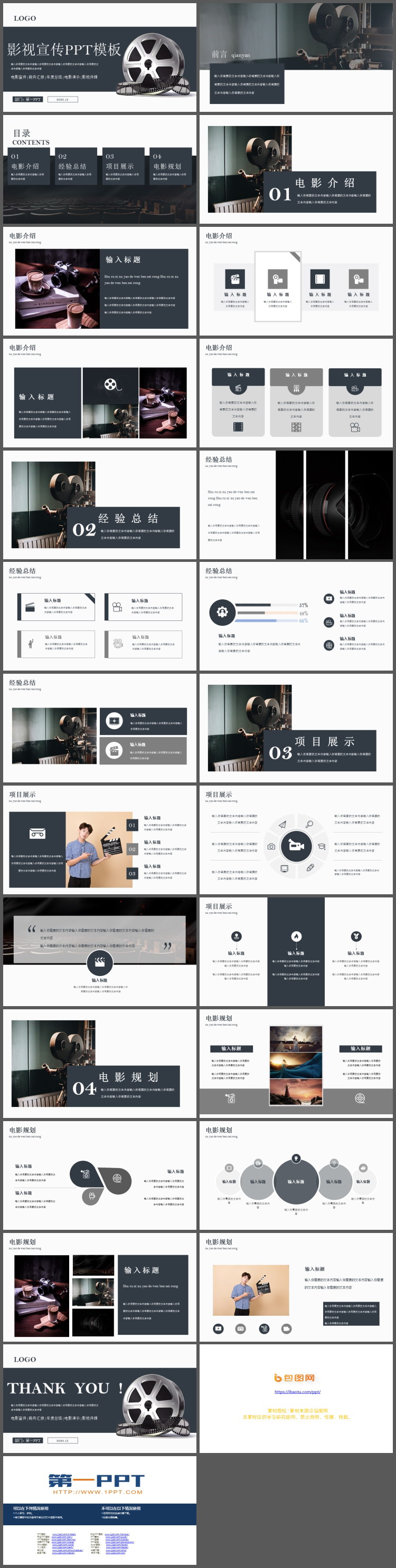PowerPoint模板内容页,由23张灰色扁平化幻灯片图表,搭配PPT文字排版。另外使用了电影放映插图、影视图片等装饰。